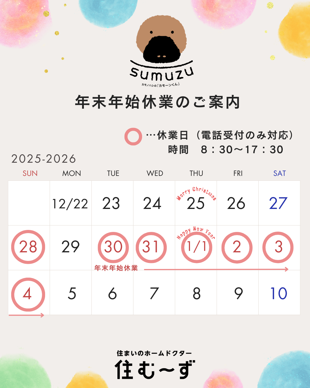 【2025/12/30~2026/1/4】年末年始のお知らせ 12/30(火)~ 1/4(日)は、年末年始休暇のため 当番スタッフによる受付(電話)のみの対応となります。(営業時間 8:30~17:30) 上記期間LINEやメールは送信いただけますが、翌営業日に確認の上ご返答させて頂きます。 期間中、ご不便をおかけいたしますがよろしくお願い致します。